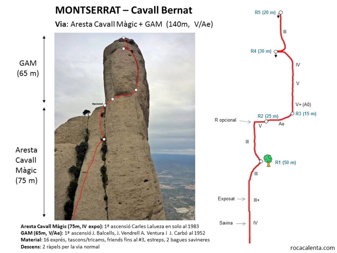 Combinació d’un parell de vies per pujar al Cavall Bernat. L’Aresta Cavall Màgic és una via de grau amable, però està desequipada perquè va ser oberta en solo integral, amb el que és molt exposada…