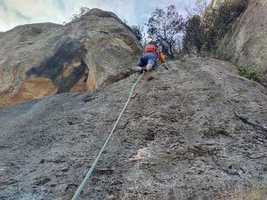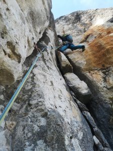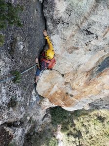 El primer llarg està molt polit, ja que és escalat sovint com una via d’esportiva, però l’adherència va millorant amb l’alçada. Al segon llarg ens ha fet molta angúnia tibar dels blocs encastats, així que hem pujat en A1 per la fissura de l’esquerra.