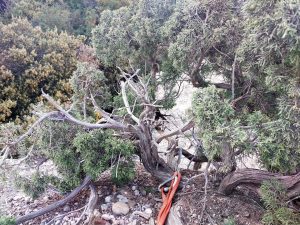 Des de la mateixa savina del cim on hem muntat reunió, fem un ràpel de 20m cap al vessant nord-oest.