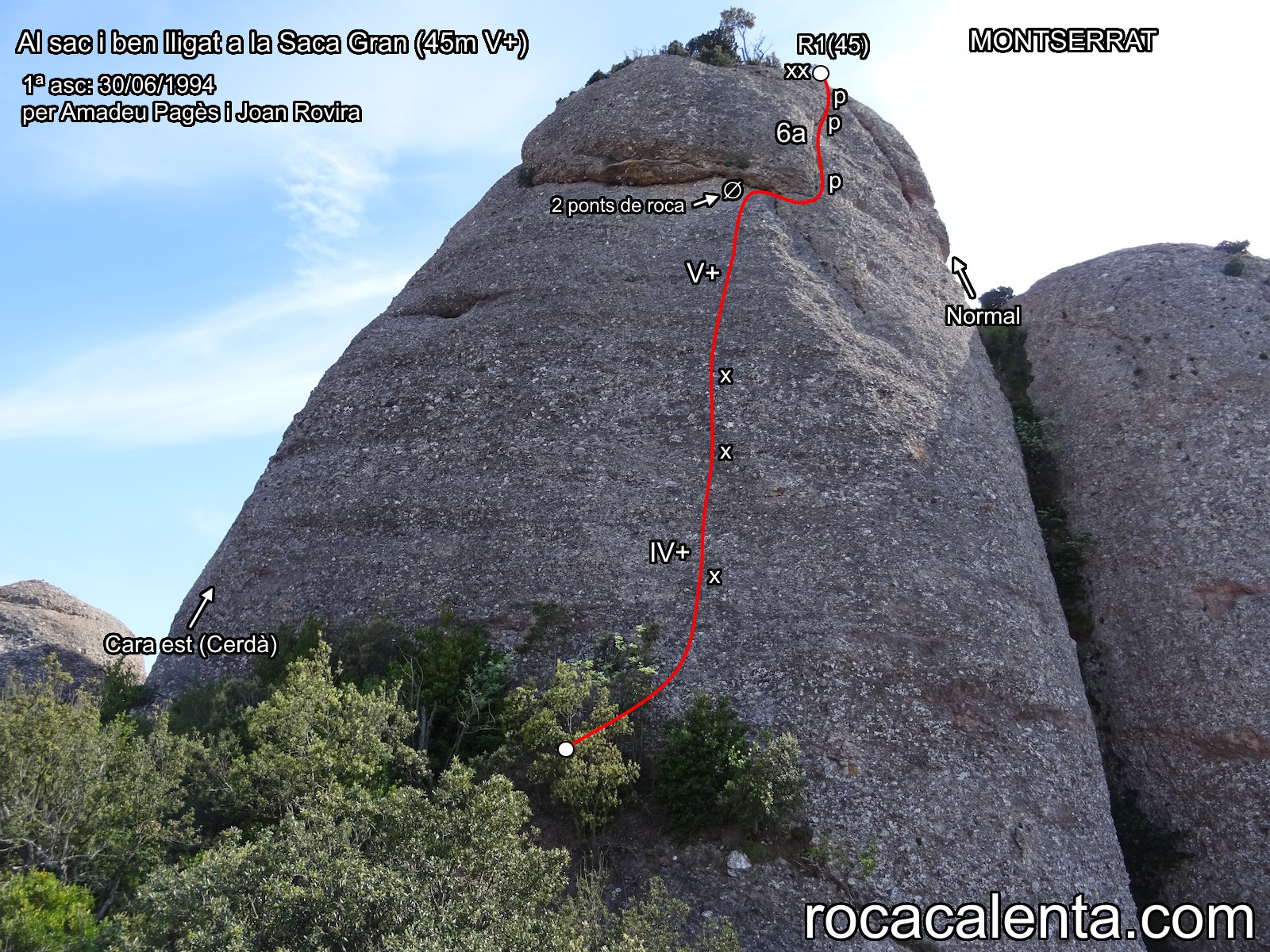 Oberta el 30/06/1994 per Amadeu Pagès i Joan Rovira. Ens ha semblat una via molt bona i recomanable, que transcorre per la gran placa del vessant nord de la Saca Gran. La part més obligada és el tram de V+ després de la tercera xapa, uns metres on cal anar bé de finura montserratina i on no hem vist opció de posar res fins arribar als 2 ponts de roca. Als darrers metres trobem un magnífic diedre, molt vertical i de bon protegir.